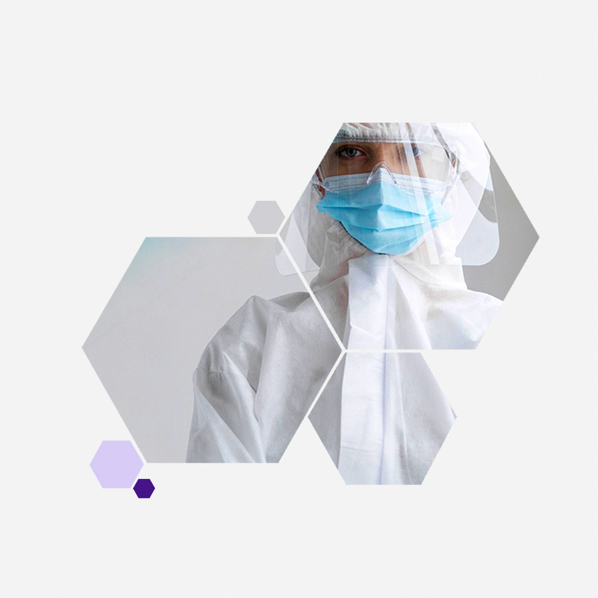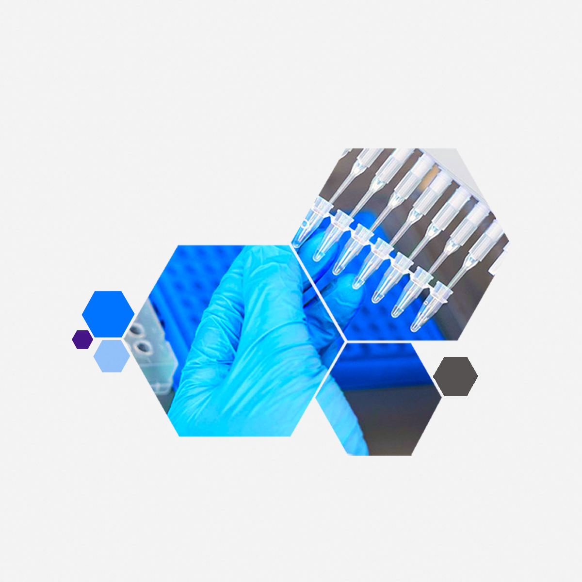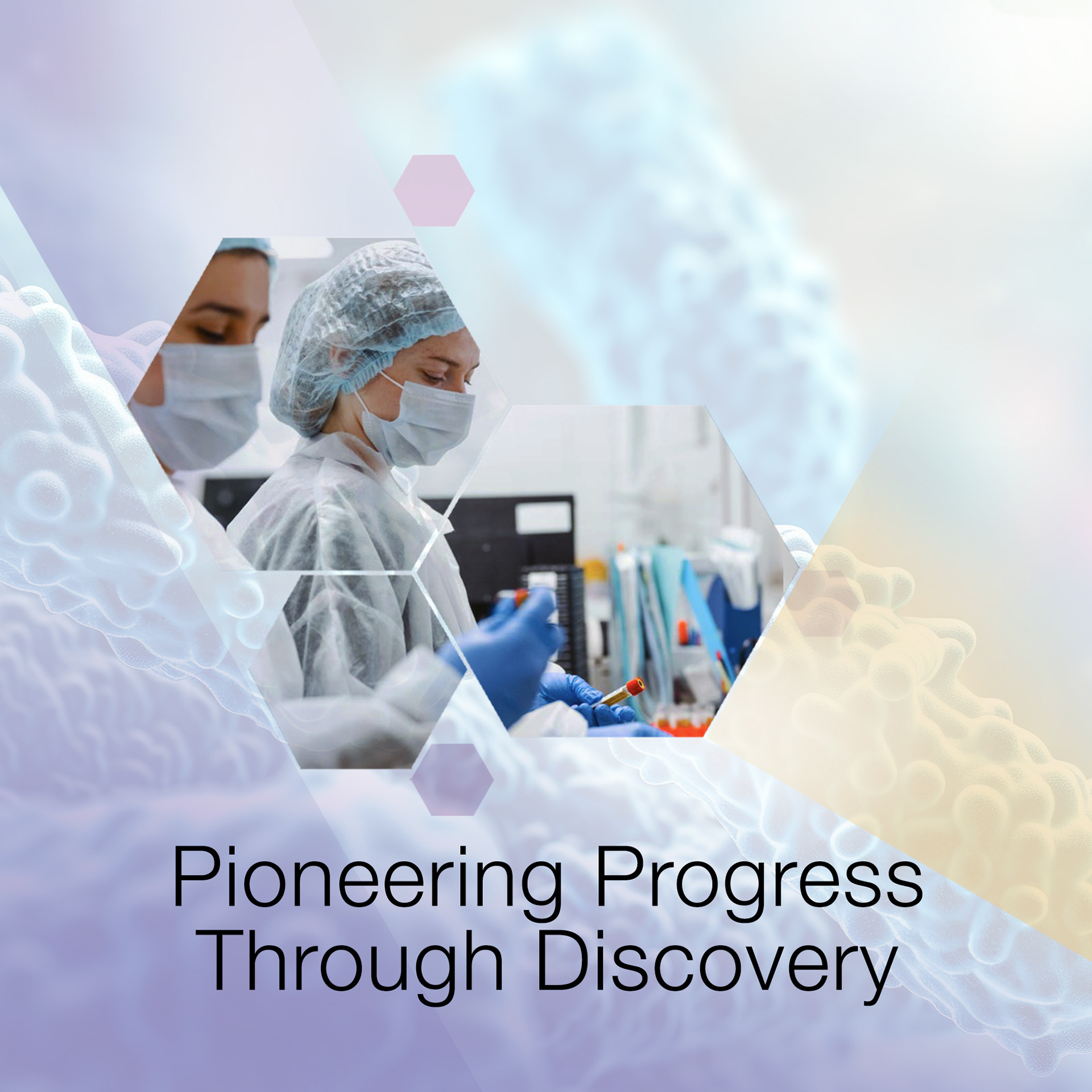 I introduced a translucent geometric shape, a stylized hexagon, layered across laboratory imagery to create a strong visual signature that suggests molecular structures and scientific breakthroughs.